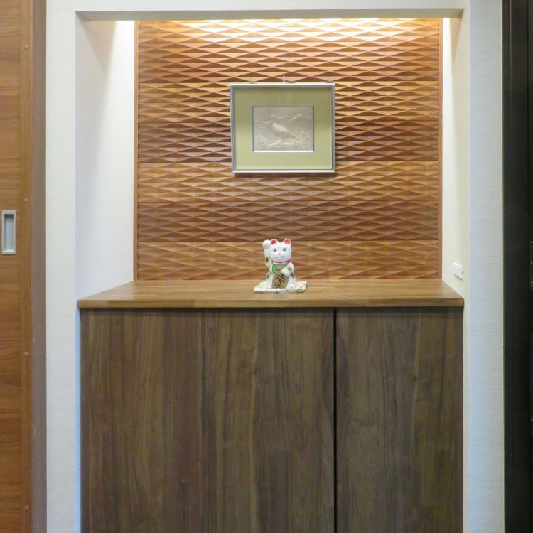 間接照明で下足箱上の壁を優しく照らします。